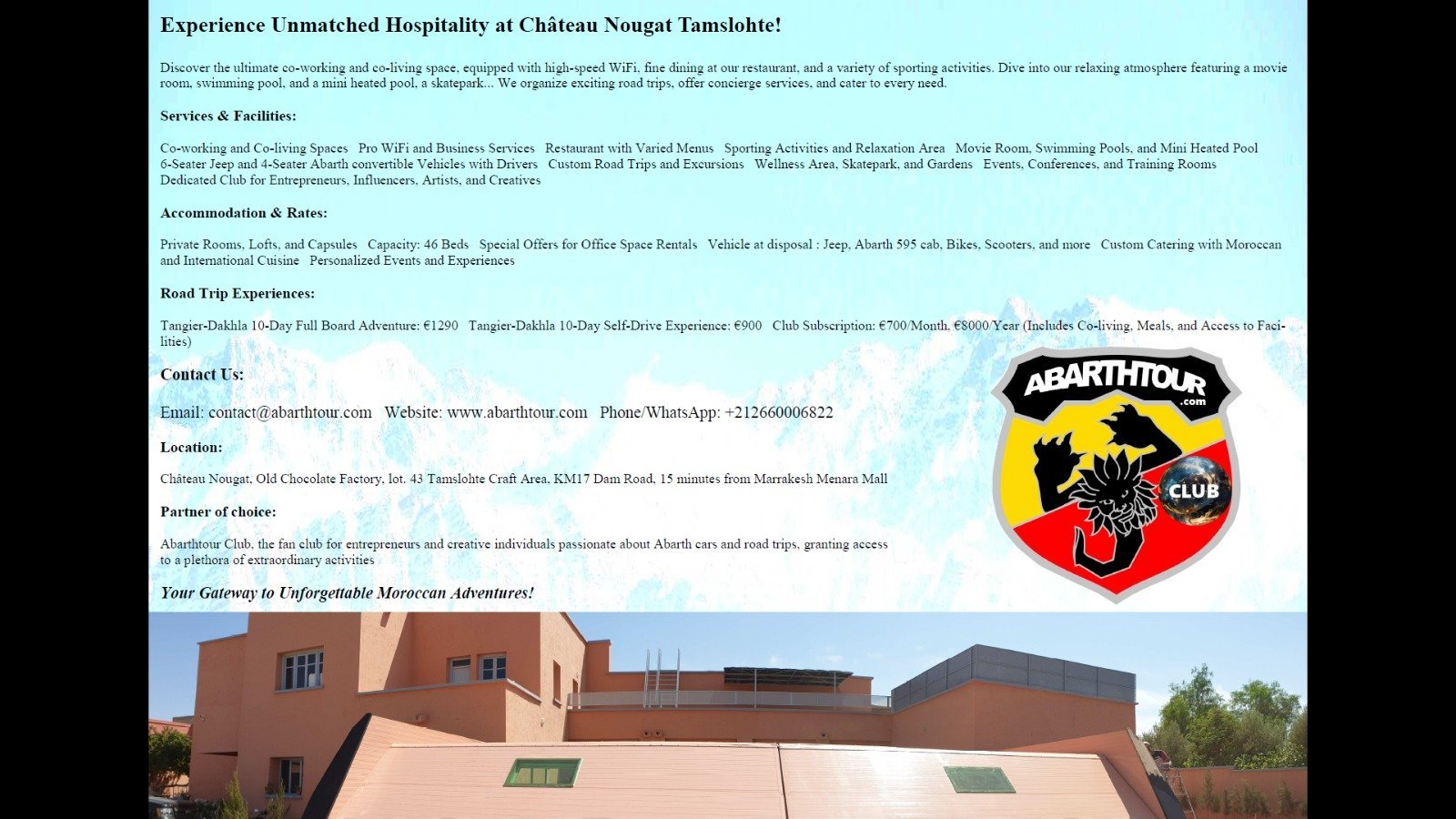 You organize a party with friends, family, or colleagues. Choose Abarth Tour Marrakech to ride around Marrakech and go to our partner CHÂTEAU NOUGAT (3000 square meters just for you) for a quiet place to party (DJ ready), have fun (restaurant, sports room, swimming pool, skate miniramp, relaxing room, cinema, multi- media), and enjoy many activities on-site (20 minutes from the Morocco Mall in the direction of Amimiz road).